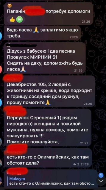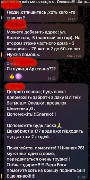 "Херсон нормально, а ось лівий берег біда, люди сидять на дахах, старенькі, різні, мої знайомі сидять на дереві з двома маленькими дітьми, евакуація заборонена, орки забороняють рятувати людей на човнах, пропало багато людей".