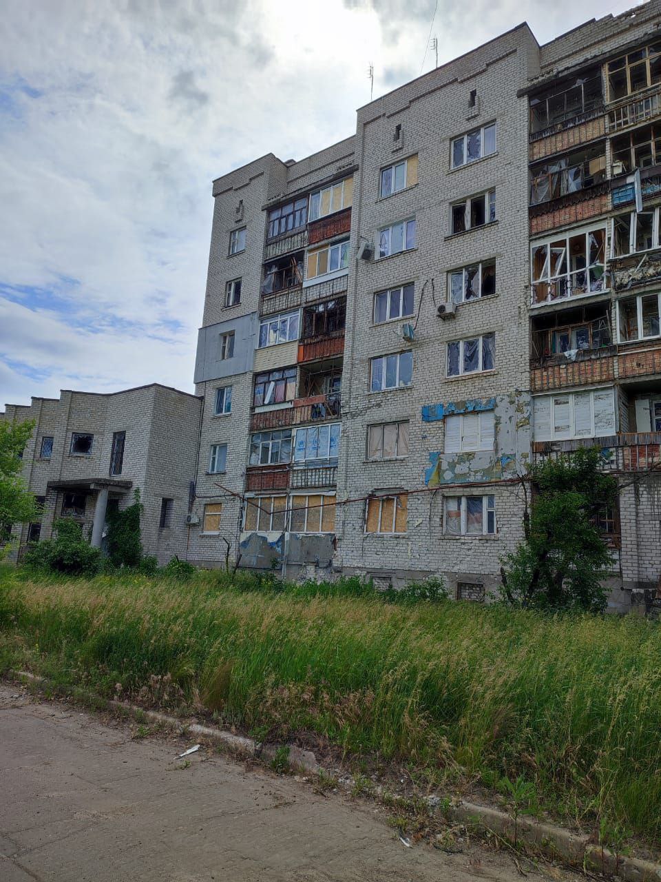 На світлинах один з житлових комплексів міста. Розбиті, потрощені та спалені будинки так звана "влада" лагодити не стала. Подекуди господарі квартир закрили вибиті вікна плівкою та фанерою. У дворах ні душі.