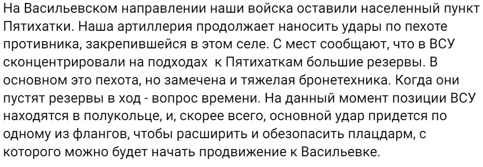 "Наші війська відійшли з населеного пункту. ЗСУ сконцентрували на підходах до П'ятихаток резерви. Коли вони пустять їх у хід – питання часу".
