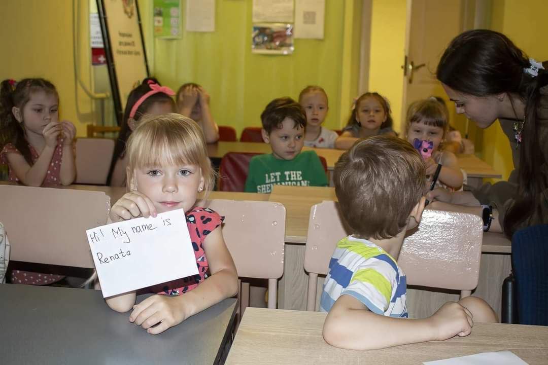 На вступному занятті викладачка навчала маленьких переселенців вітатися англійською, називати та писати свої імена. Крім того, діти спілкувалися та малювали, промовляючи англійською базові кольори.