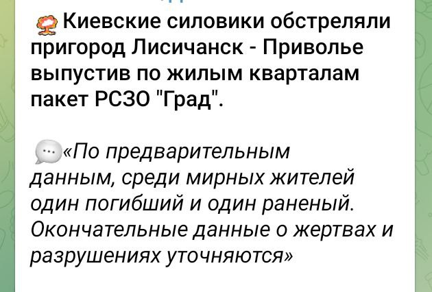 "Київські силовики обстріляли передмістя Лисичанська - Привілля. Випустив по житловим кварталам пакет "Градів", - йдеться у повідомленні.