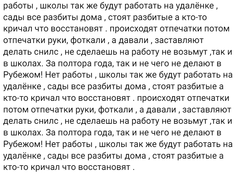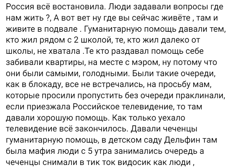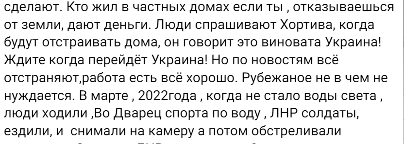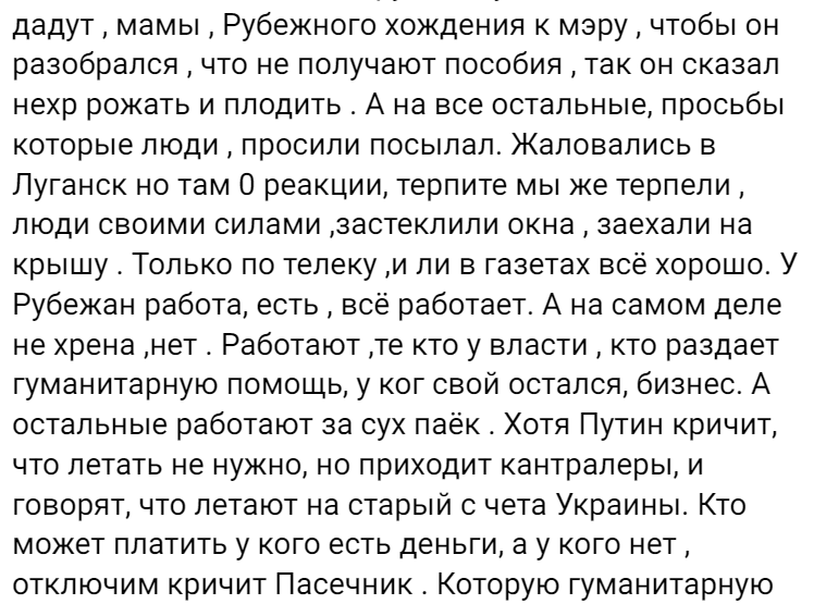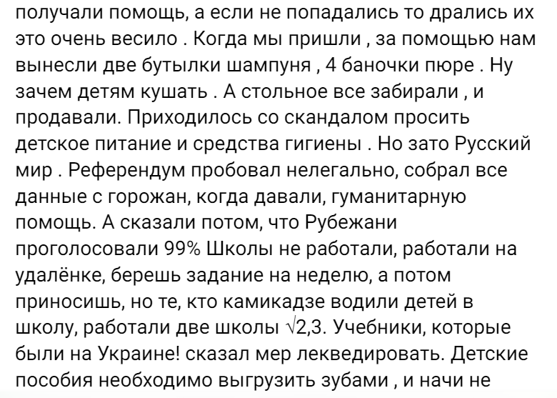 ... будматеріали не доходять до мешканців Рубіжного, бо Пасічнику та Хортіву потрібніше, перед камерою дадуть, а решта собі, так і продукти, ліки. Росія кричить, ми допомагаємо. Лишили всього, а тепер допомагаєте. Як можна прожити на 10 000 рублів мамочкам, пенсіонерам? Ви ж кричали, що житимуть добре! Чеченці того року грабували квартири, приходили як собі додому, що сподобалося - забирали, хто не сподобався - розстріл чи підвал...