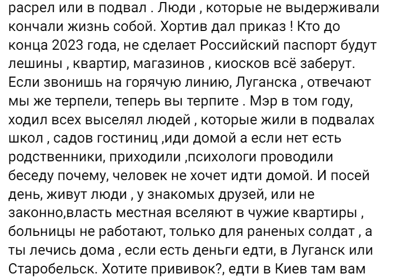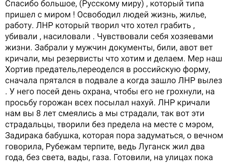 Дякую велике (російському світу), який типу прийшов зі світом! Звільнив людей від життя, житла, роботи. ЛНР який творив що хотів – грабували, вбивали, ґвалтували. Почувалися господарями життя. Забирали у чоловіків документи, били, а у відповідь ми кричали резервісти, що хочемо те й робимо. Мер наш Хортів - зрадник, переодягся у російську форму, спочатку ховався у підвалі, а коли зайшло ЛНР виліз...
