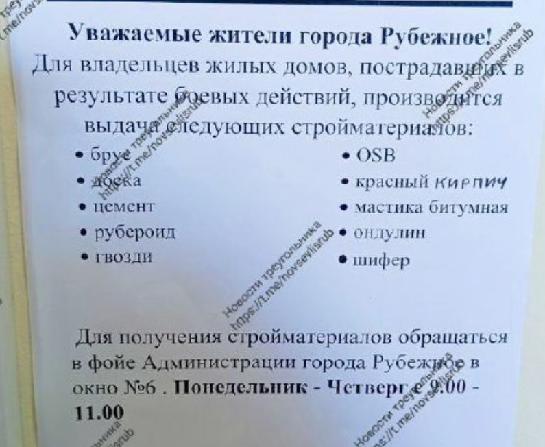 У тимчасово окупованому Рубіжному Луганській області місцева "адміністрація" "вирішила" питання "відновлення" міста - роздають будівельний матеріал мешканцям зруйнованих будинків для самостійного ремонту.