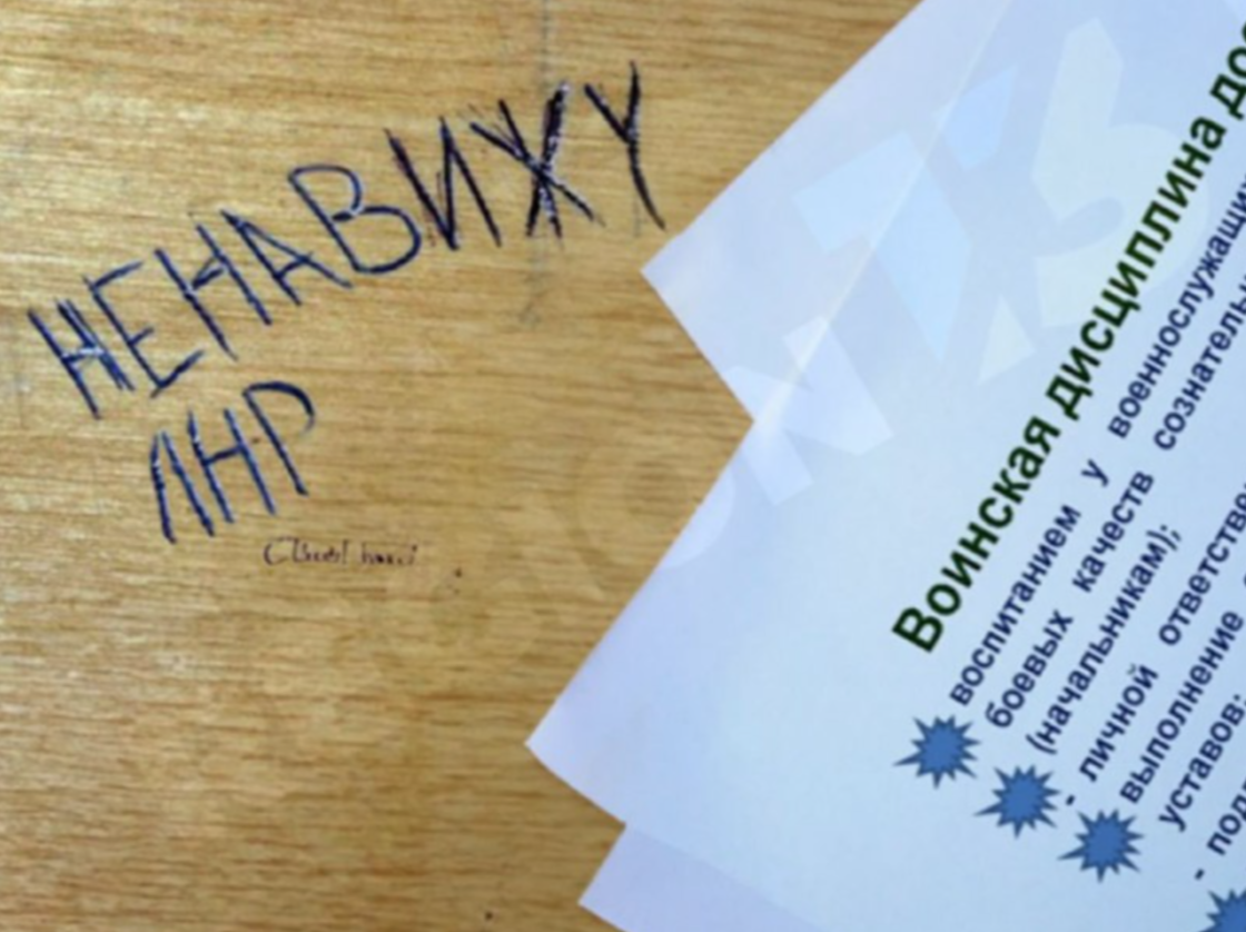 На фото - нашкарябаний на парті кульковою ручкою напис "ненавиджу ЛНР" та захоплені об'єктивом листівки на тему "військової дисципліни".