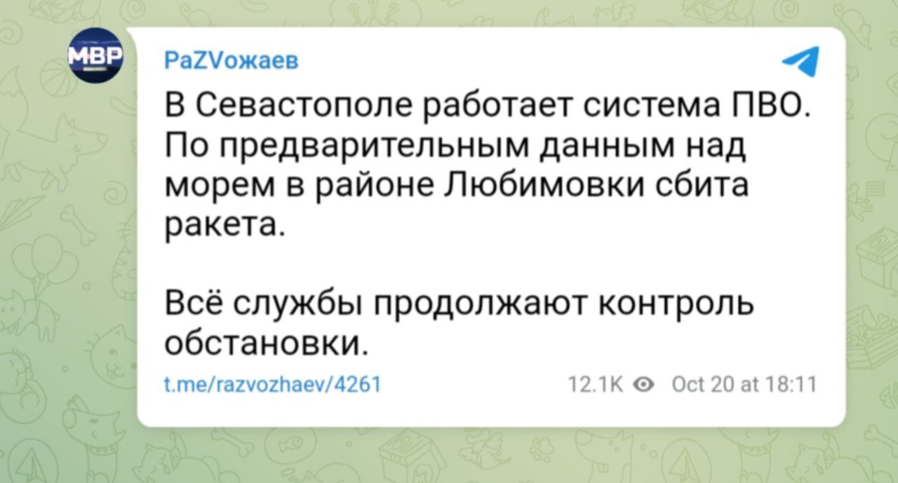 Пропагандисти повідомляють про нібито роботу ППО у Севастополі та "збиття" двох ракет. Про це пише і так званий "губернатор" Михайло Развожаєв.