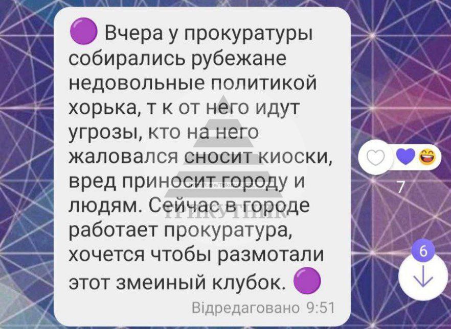 Місцеві жителі, які не вдоволені "політикою" Хортіва, зібралися біля приміщення так званої "прокуратури" з проханням "розмотати зміїний клубок". За їх словами, фігурант справи погрожує тим, хто на нього скаржиться та "завдає шкоди місту і людям".
