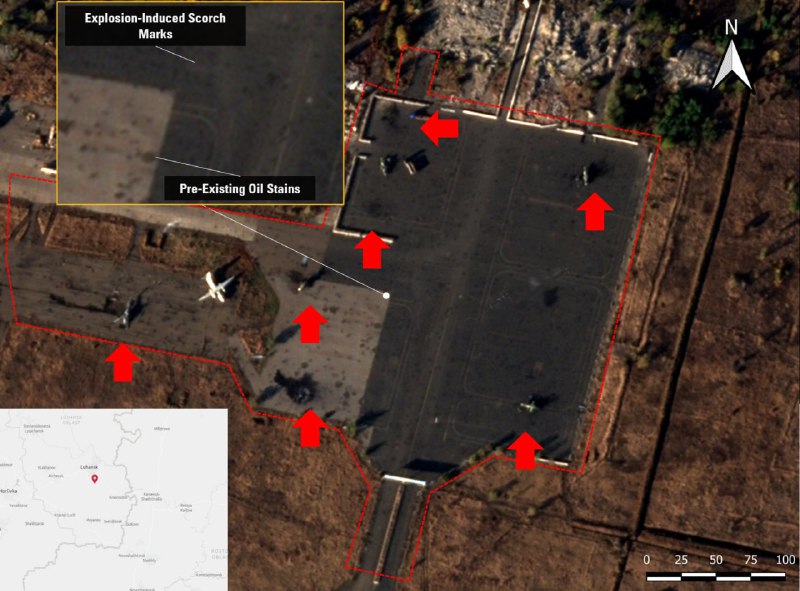 "З'явилося відео, що підтверджує точне влучення по території Луганського аеропорту. Видно сліди від касет, видно гелікоптери під ремонтом (без лопатей), частину вже прибрали", - підписав відео блогер.