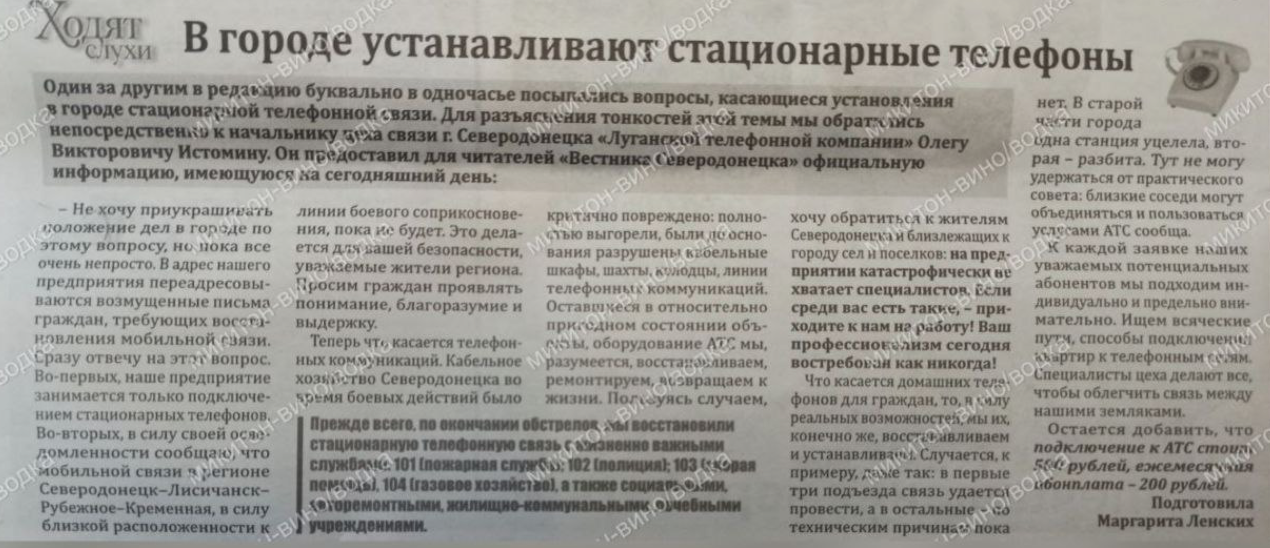 Telegram-канал наводить статтю місцевої пропагандистської преси, в якій радісно заявляється, що сєвєродончани "засипають питаннями" "телефонну компанію" про встановлення стаціонарних телефонів. Зазначається, що мешканців Сєвєродонецька більше хвилює відновлення мобільного зв'язку, але це не в компетенції "телефонної компанії". А ось стаціонарні телефони - будь ласка. Підключення оцінюється в 500 рублів, щомісячна абонплата - 200 рублів. Куди городяни дзвонитимуть по стаціонарних телефонах - незрозуміло.