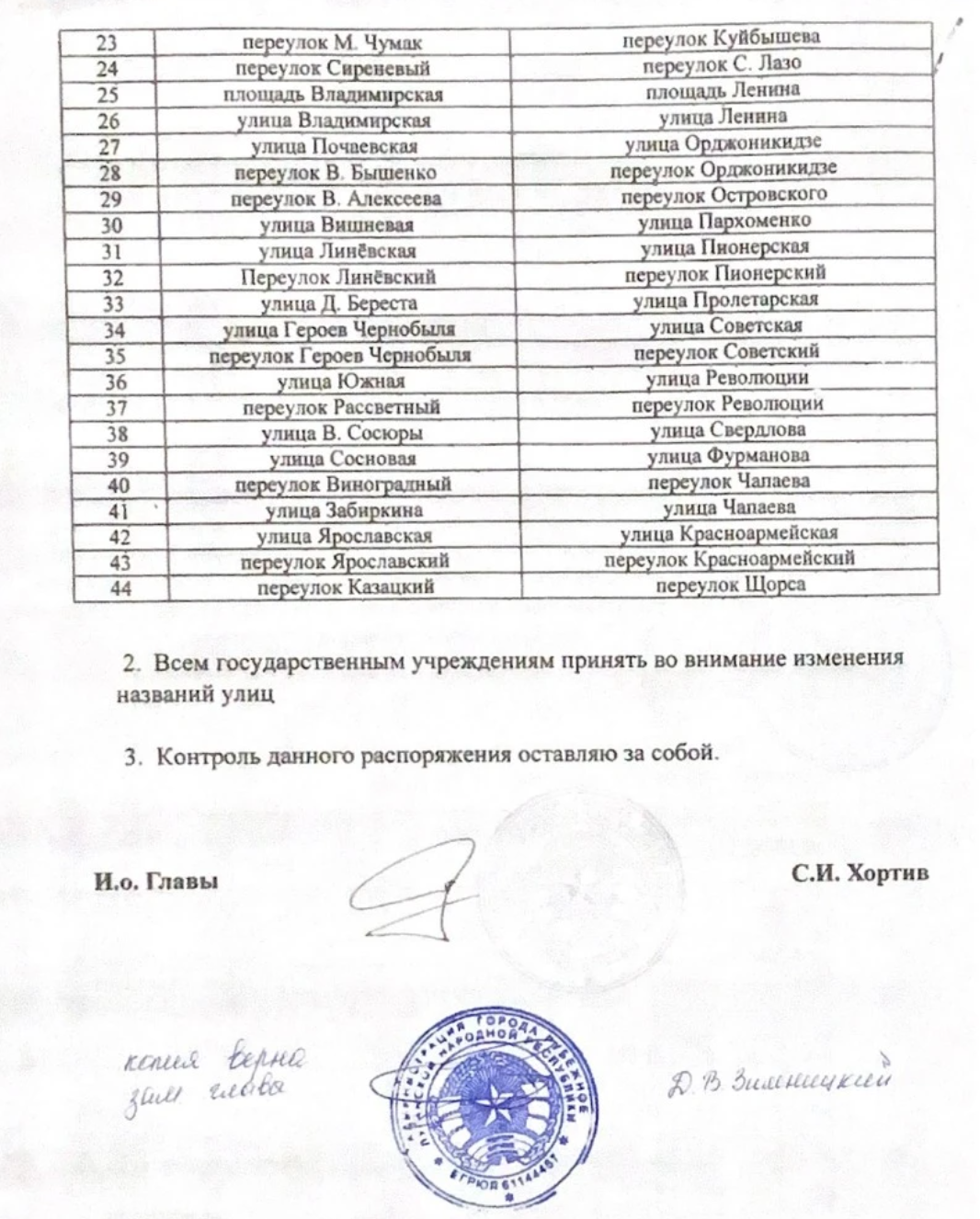 Окупаційна "адміністрація" Рубіжного видала "розпорядження" про перейменування вулиць. Вулицям міста будуть повернуті старі назви, які були актуальні до 2014 року. "Документ" підписано так званим "мером" Рубіжного Сергієм Хортівим.