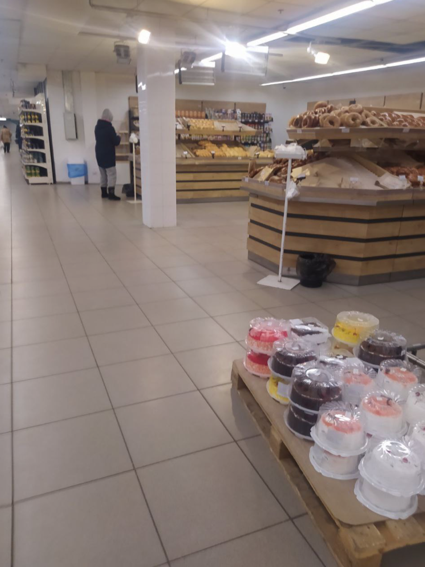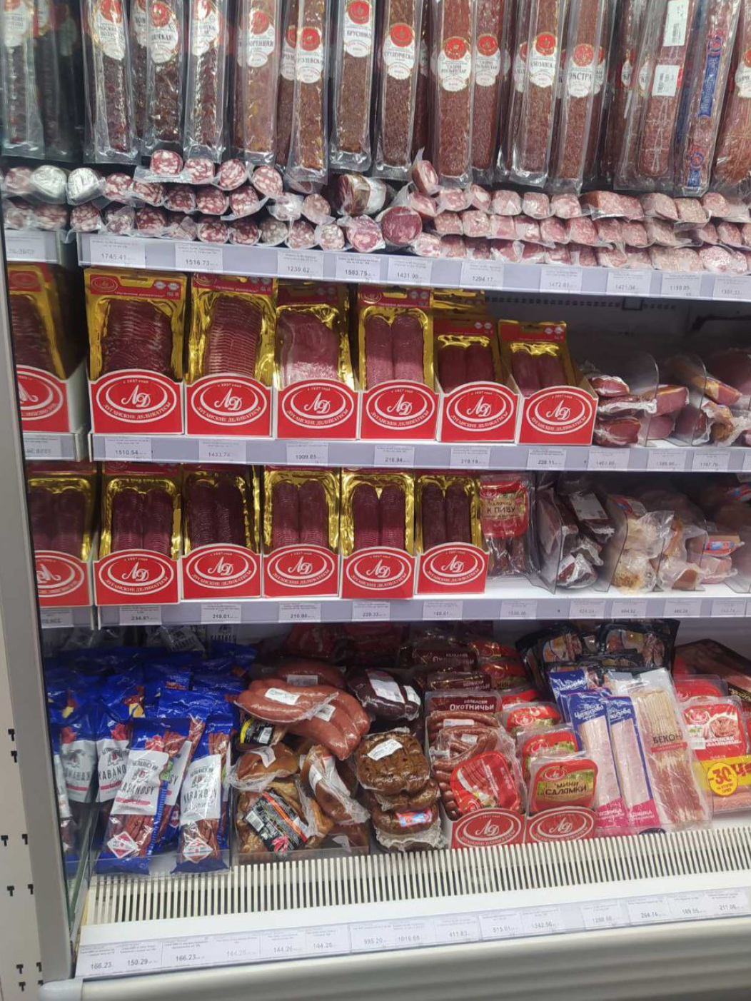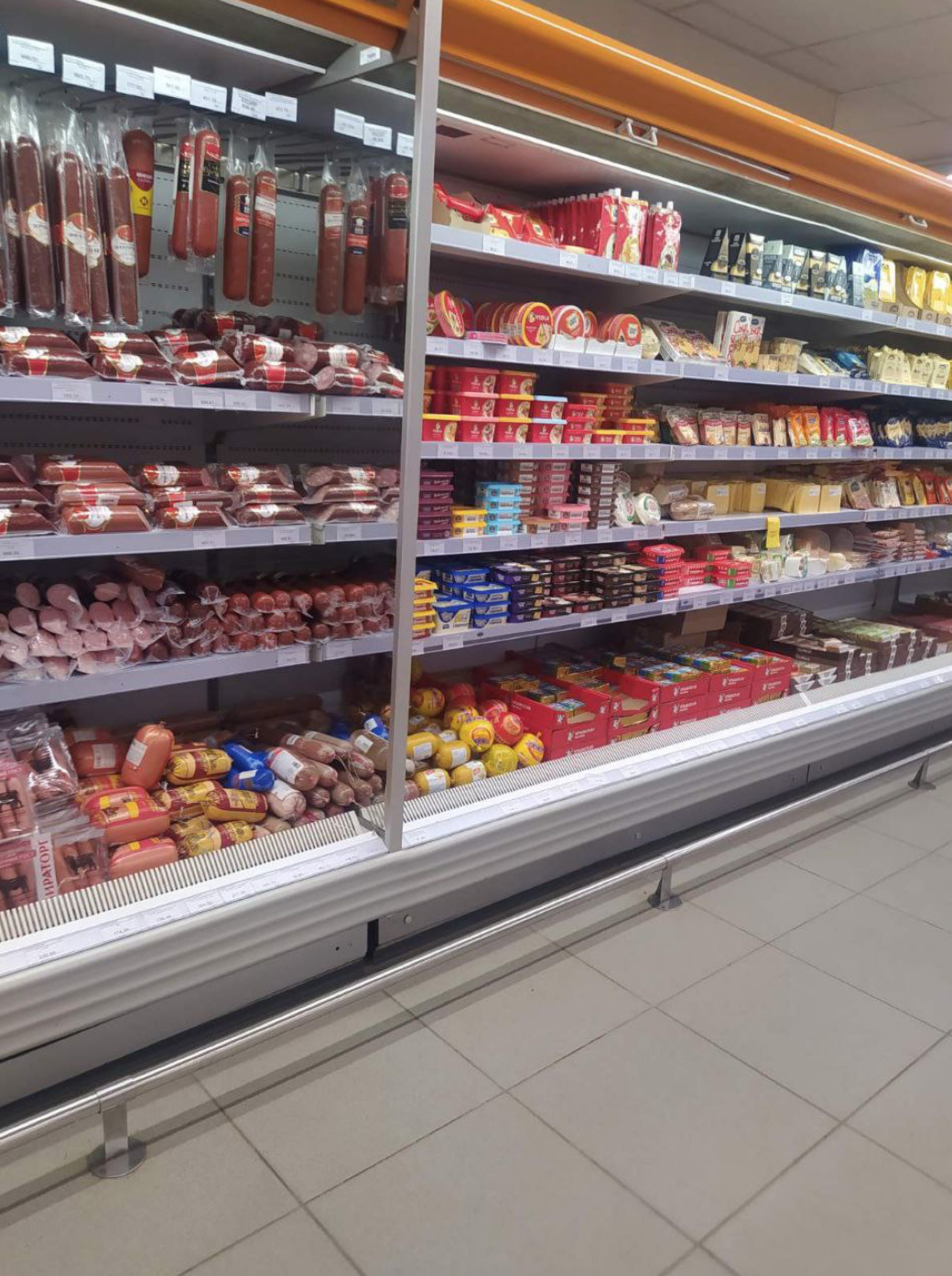 На фото представлений асортимент товарів, які продаються в одному із супермаркетів міста. На полицях є ковбаси, сири, хліб та навіть щось схоже на торти. Проте покупців нема. У супермаркеті практично немає людей. Очевидно, вартість продуктів місцевим жителям не по кишені.