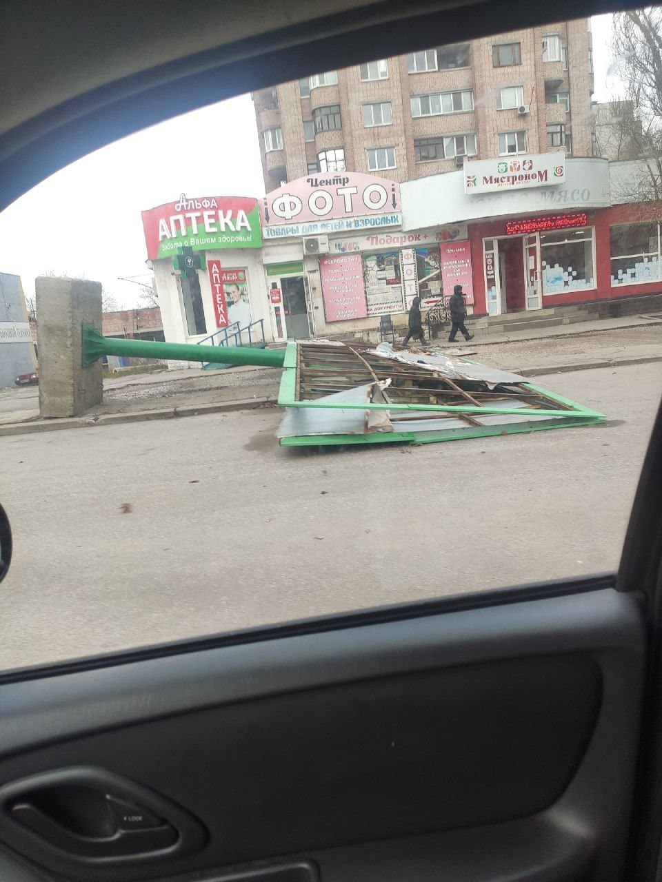 На оприлюднених знімках можна помітити білборд, який упав на дорогу. Імовірно, його знесло потужним вітром, адже подібна ситуація відбулась у багатьох містах.