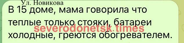 "Опалення зараз у місті - на самому мінімумі. Люди мерзнуть. Тепло в системі підтримують, щоб не розмерзлися батареї та труби, оскільки проплати за тепло зараз майже немає. Уявіть ситуацію: на цілий відновлений дев'ятиповерховий будинок припадає лише кілька квартир, в яких реально живуть люди, і ті не платять за тепло. Таким чином, немає сенсу заради порожнього будинку на кілька під'їздів включати батареї на максимум".