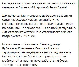 Також на пропагандистських пабліках з'явилася інформація, що окупаційний глава ЛНР Леонід Пасічник повідомив про тестовий запуск мобільного інтернету на окупованій Луганщині.
