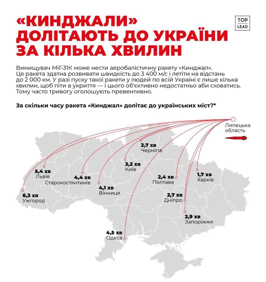 Також у мережі з'явилася інфографіка, яка дає розуміння, скільки часу потрібно ракеті "Кинджал", щоб долетіти від аеродрому Липецька РФ до великих обласних центрів України.