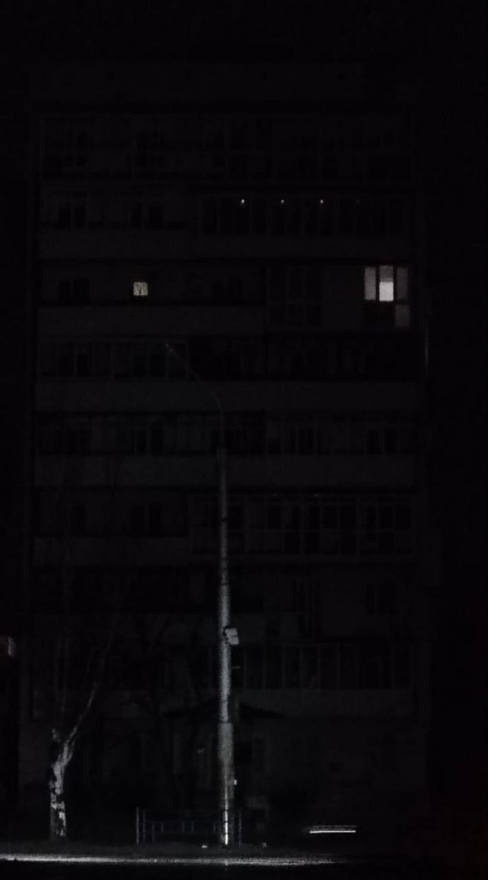 На кадрах вечірній проспект Гвардійський в окупованому місті. Лише в декількох квартирах горить світло. Це свідчить про мізерну кількість мешканців, які проживають у багатоповерхівках.