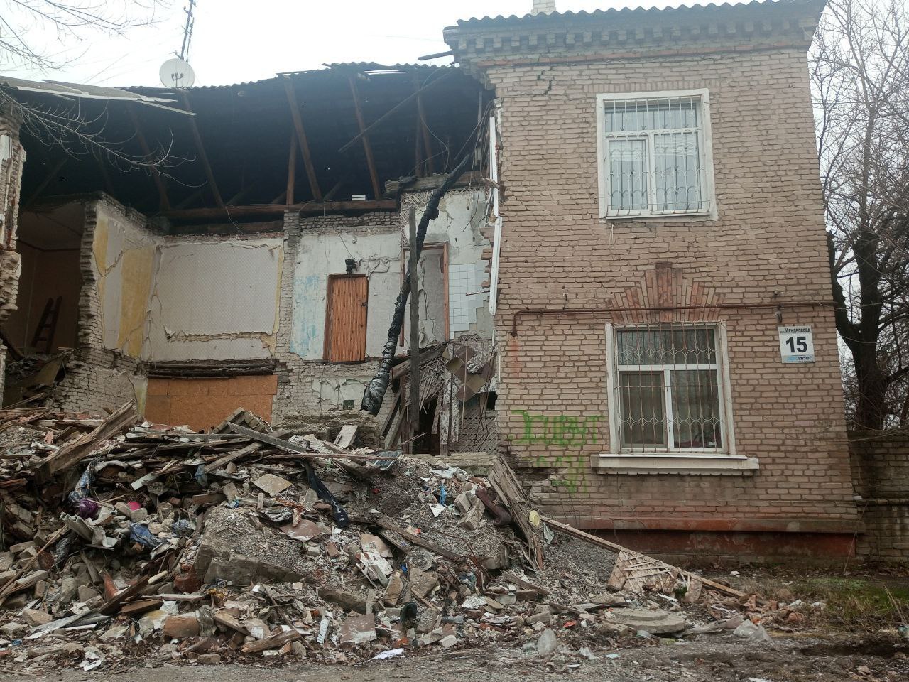 На перших фото можна побачити обвалену частину будинку по вулиці Менделєєва 15. Напевно російське "відновлення" не дісталося до цього району міста.