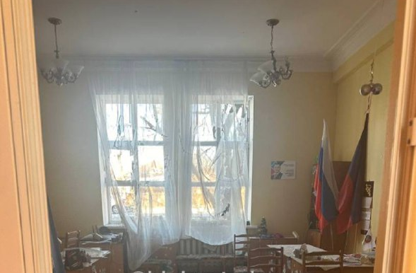 В окупованому Донецьку снаряд прилетів до кабінету колаборанта, так званого "голови Куйбишевського району" Івана Адамця у ПК ім. Куйбишева.