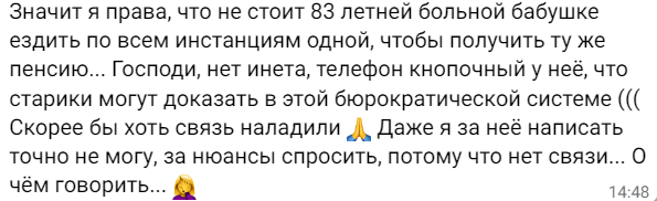 "Телефонувала бабуся з Лисичанська. Пенсія 12.500 після перерахунку. Стаж безперервний 36 років. Ходила після перерахунку до ПФ Лисичанська. Чому так мало? Відповідь. Поки що так, нам як дадуть більше, так і отримаєте... Нормально? Користуються тим, що ні інтернету, люди ноги б'ють, старі. Бабуся каже, історія така не в неї однієї. Поки всі старі стоять за водою, те саме розповідають, як їх футболять з Лисичанського пенсійного фонду і що робити не знають",