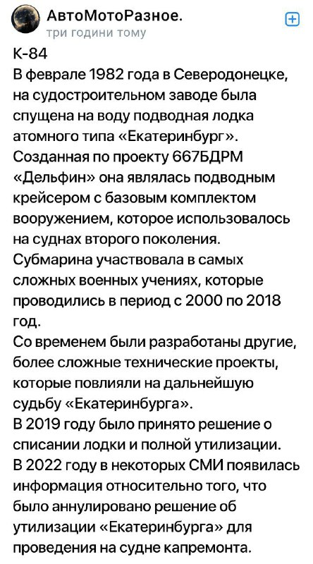"У лютому 1982 року в Сєвєродонецьку на суднобудівному заводі було спущено на воду підводний човен атомного типу "Єкатеринбург"... Субмарина брала участь у найскладніших військових навчаннях, які проводилися в період з 2000 по 2018 рік... У 2019 році було прийнято рішення про списання човна та повну утилізацію", - йдеться в повідомленні.
