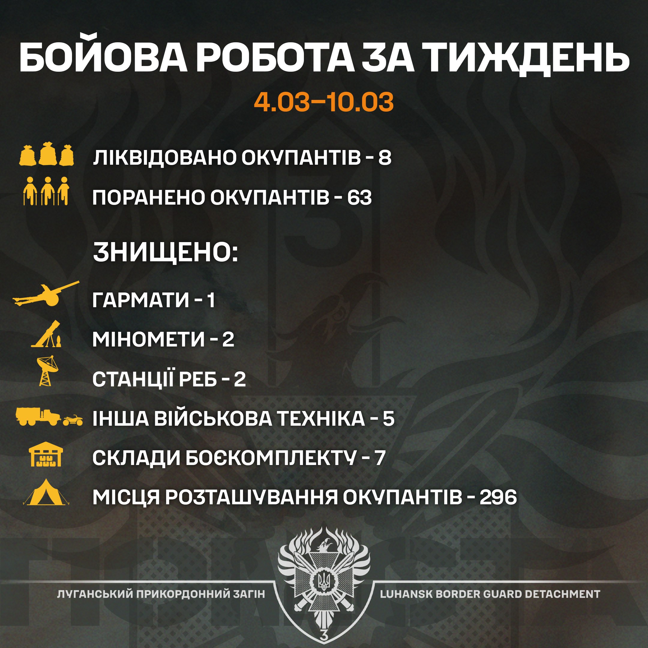 За даними бригади, вісьмох окупантів ліквідували, 63 отримали важкі поранення, а ще знищено склади боєприпасів, техніку та зброю – статистика бойової роботи за тиждень 04.03-10.03.