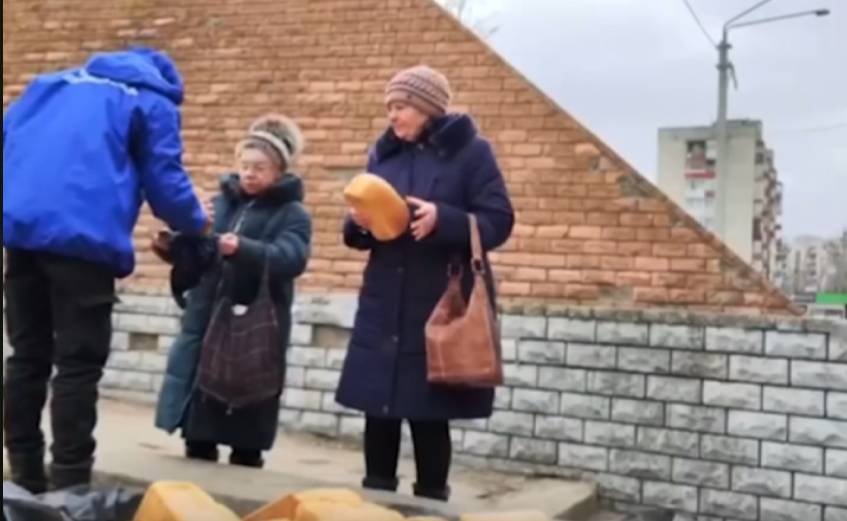 В окупованому Лисичанську на Луганщині російські пропагандисти підгодовують місцевих жителів перед "виборами". Роздають хліб та гарячі обіди на вулиці.