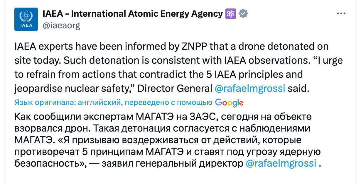 "ЗАЕС проінформувала експертів МАГАТЕ про те, що на території станції сьогодні здетонував дрон. Таку детонацію спостерігали й ми", - повідомив Гроссі.