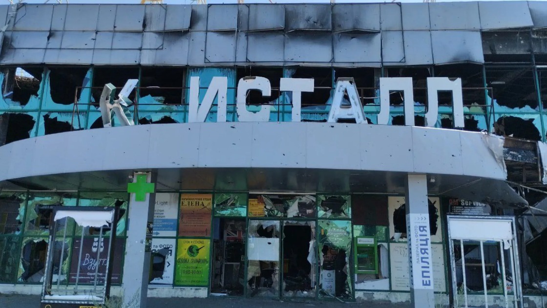 Сучасний просторий супермаркет, який займав більшу частину першого поверху ТЦ "Кристал", повністю знищено. Внаслідок ворожих обстрілів будівля торговельного комплексу практично повністю вигоріла. Всередині - купи зламаного металу, знищені вогнем прилавки, каси, ескалатор.