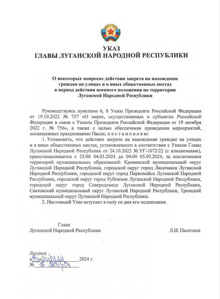 "Глава Республіки Леонід Пасічник підписав наказ про призупинення дії комендантської години, щоб луганчани змогли відвідати службу у Великодню ніч. Але треба бути обережнішими", - наголосив "глава".