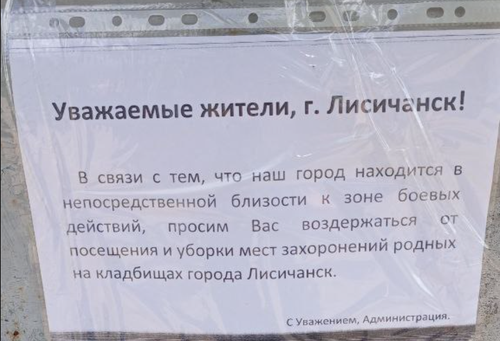 У захопленому російськими окупантами Лисичанську Луганської області з'явилися оголошення із закликом відмовити від відвідування цвинтарів.