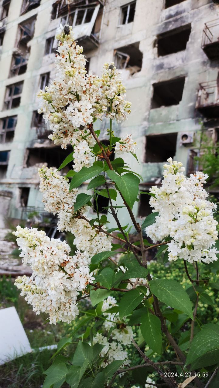 На наступних кадрах квітучий бузок на фоні руїн у 79 мікрорайоні міста.