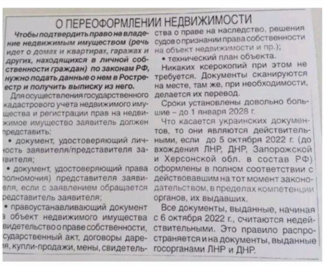 Так за повідомленням окупантів, "щоб підтвердити право на володіння нерухомим майном за законами РФ, потрібно подати дані про нього в Ростреєстр і отримати виписку з нього. Терміни встановлені - до 1 січня 2028".