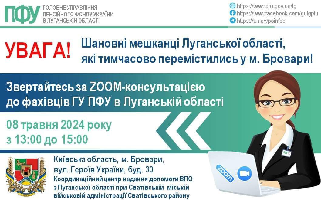 Також у Луганській ОВА повідомили, що у середу, 8 травня, з 13:00 до 15:00, у Броварах, у місцевому хабі Сватівського товариства відбудеться онлайн-консультація від спеціаліста Головного управління Пенсійного фонду України у Луганській області.