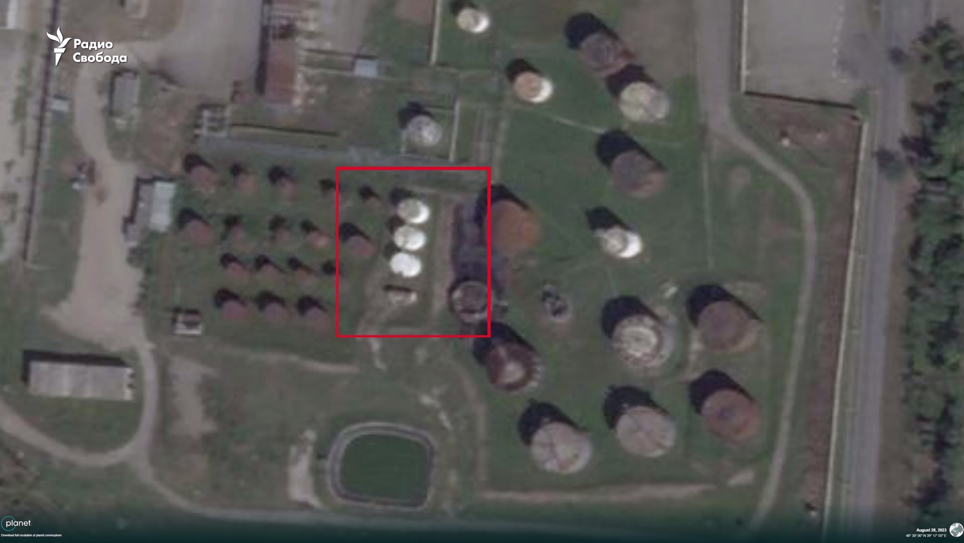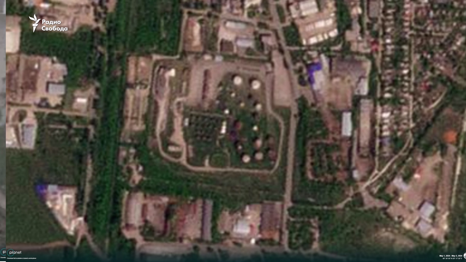 На кадрах з космосу, які були зроблені 8 травня, видно сліди пожежі та як мінімум три знищені вогнем місткості для зберігання палива на нафтобазі в Артемівському районі Луганська.