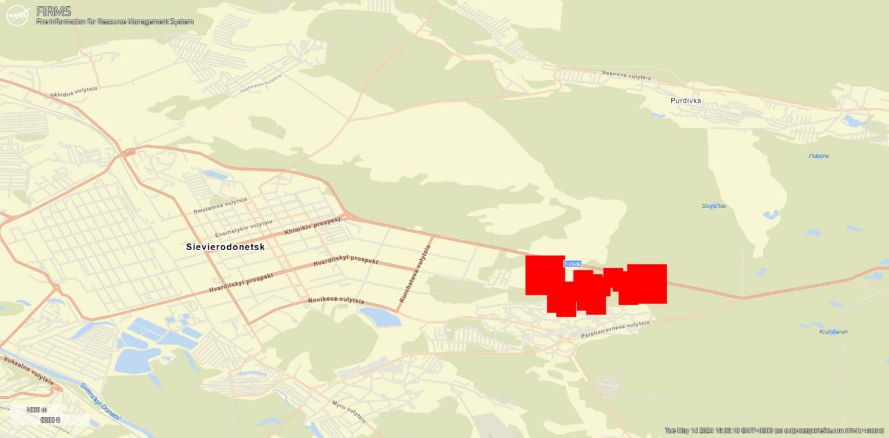 - вогонь перетнув адміністративну межу міста Сєвєродонецьк. Розпочались пожежі у житловій забудові. Фіксуються пожежі за адресами вулиця Червона 43 і Каштанова 5;