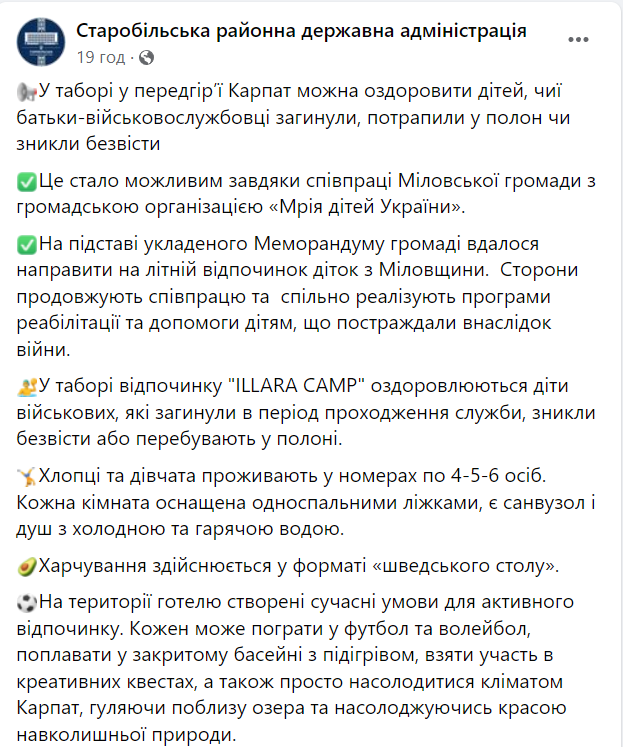 Діти військовослужбовців із Луганської області, чиї батьки загинули, зникли безвісти чи перебувають у полоні, отримали можливість провести літній відпочинок та оздоровлення у передгір'ї Карпат. Це стало можливим завдяки співпраці Міловської громади із громадською організацією «Мрія дітей України».