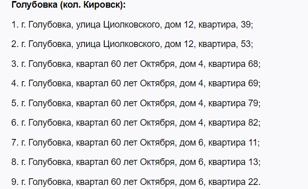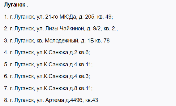 До нового списку увійшли понад 50 адрес. У Первомайську це 22 квартири у різних районах міста. У Голубівці (колишньому Кіровську) – 9 квартир. У Лисичанську – 30 квартир лише в одному будинку по кварталу Молодіжний. У Луганську – 8 квартир, а у Щасті – 10.