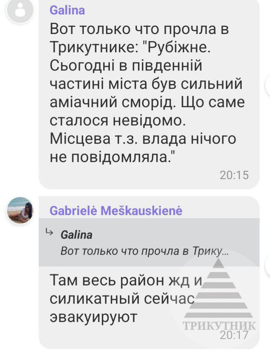 "Рубіжне. Сьогодні в південній частині міста був сильний аміачний сморід. Що саме сталося невідомо. Місцева т.з. влада нічого не повідомляла", - йдеться у повідомленні.