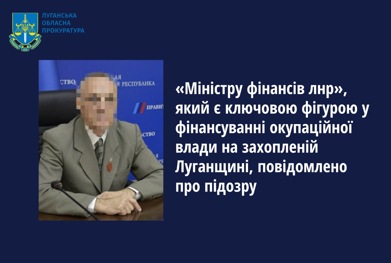 Прокуратура Луганської області повідомила про підозру "міністру фінансів ЛНР", ключовій фігурі у фінансуванні окупаційної "влади" на захоплених територіях Луганщини.