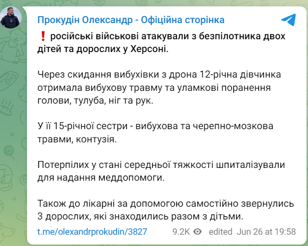 За інформацією Прокудіна, дрон скинув боєприпаси на людей. В результаті 12-річна дівчинка отримала вибухову травму та уламкові поранення голови, тулуба, ніг та рук. Її 15-річна сестра також отримала вибухову та черепно-мозкову травму, а також контузію.