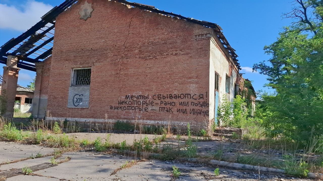 Зображення показує занедбану будівлю з обваленим дахом, де на стіні можна побачити знущальний напис: "Мечты сбываются! Некоторые - рано или поздно, а некоторые - так или иначе."