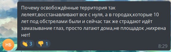"Чому звільнені території так плекають, відновлюють все з нуля, а в містах, які 10 років під обстрілами були і зараз так само страждають, йде замазування очей, просто латають будинки, ані дитячих майданчиків, нічого немає!", - йдеться у повідомленні.