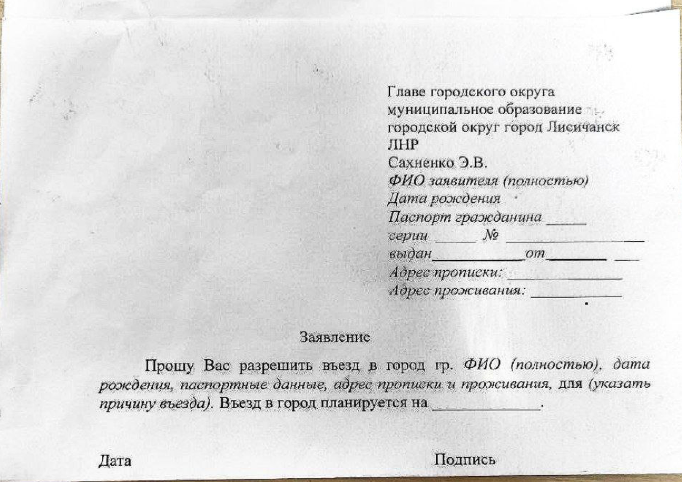 "Зміна від зміни на блокпостах відрізняється. Тому "без папірця ти комашка", і краще перестрахуватися і написати заяву на в'їзд", - пишуть у мережі рекомендацію для тих, у кого є майно на території Лисичанська, але немає прописки.