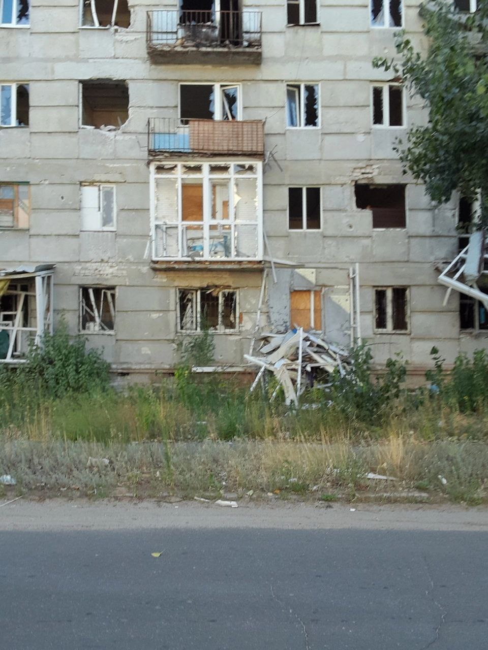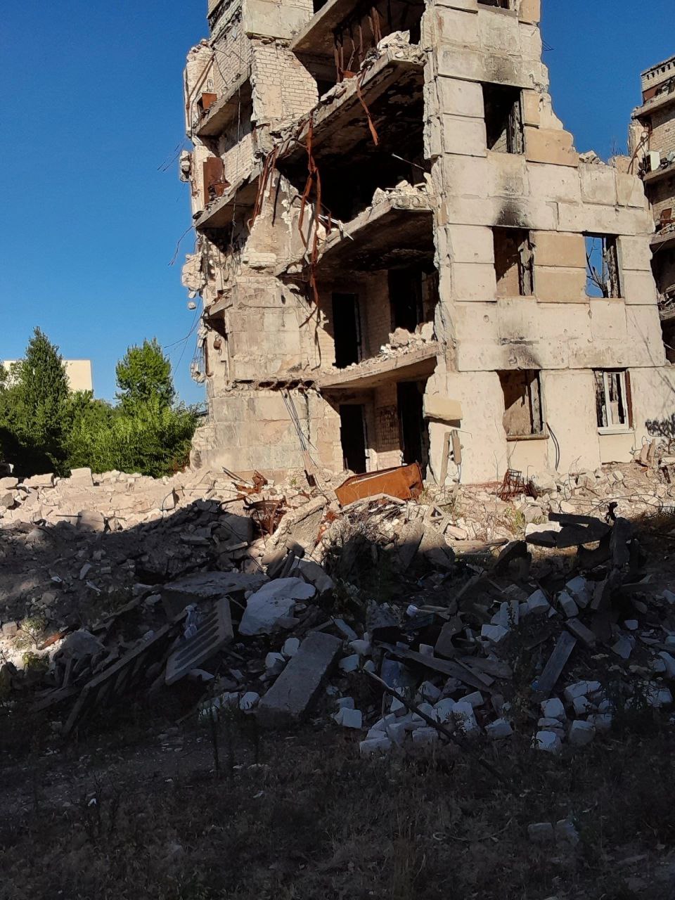 Багатоповерхівки, колись населені людьми, тепер стоять напівзруйнованими та пустими. Уламки, бетонні плити, зруйновані стіни та залишки конструкцій свідчать про масштабні руйнування, завдані обстрілами та бойовими діями.