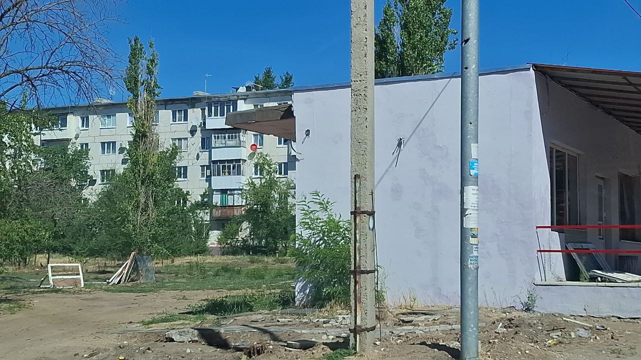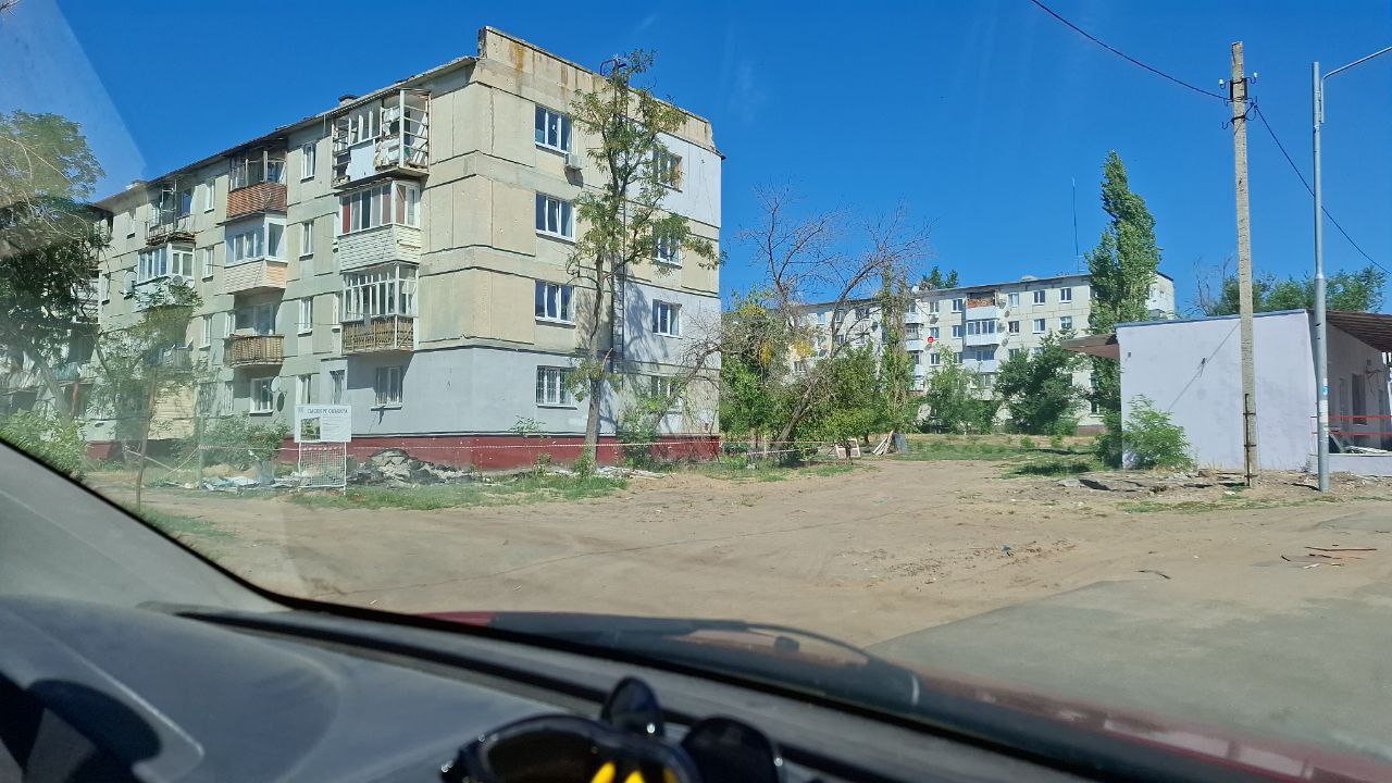 На фото видно багатоквартирний будинок, який перебуває у занедбаному стані. Фасад будівлі обшарпаний, частини стін обвалені, а вікна виглядають пошкодженими. На першому поверсі розташовані комерційні приміщення, серед яких магазин автоаксесуарів, що так потрібен людям, які живуть у надважких умовах.