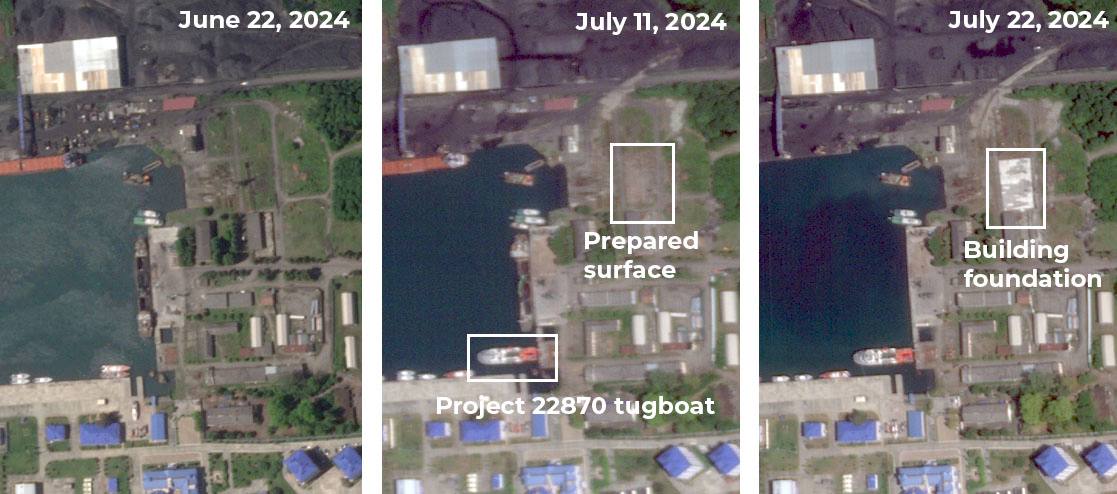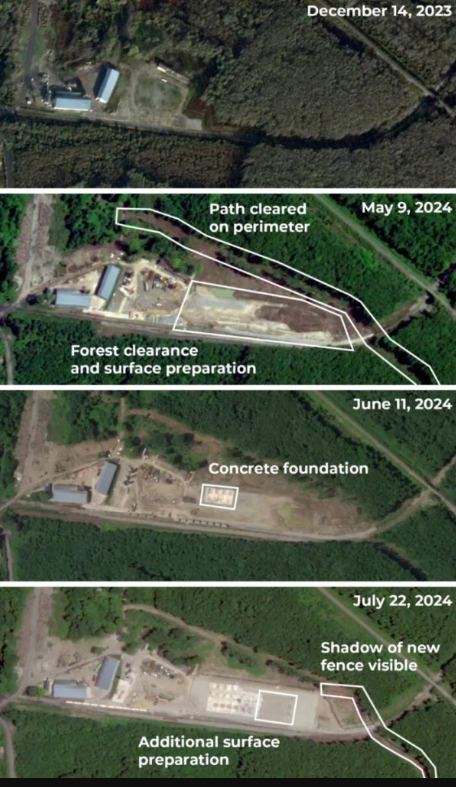 Супутникові знімки показують значні зміни в гавані Очамчирі, де з початку 2024 активно ведеться будівництво. Зведено кілька нових споруд, обладнано майданчики для нового будівництва та встановлено новий периметр, що значно збільшує розмір бази.