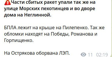 За інформацією Рятівної служби Севастополя, на пішохідному переході на вулиці Хрустальова впала частина збитої ракети. Уламки також знайшли в районі вулиці Острякова, де, за попередніми даними, горять частини збитого безпілотника.