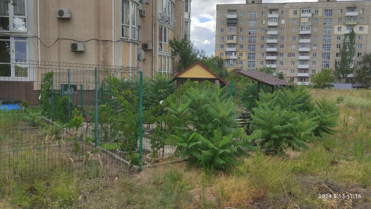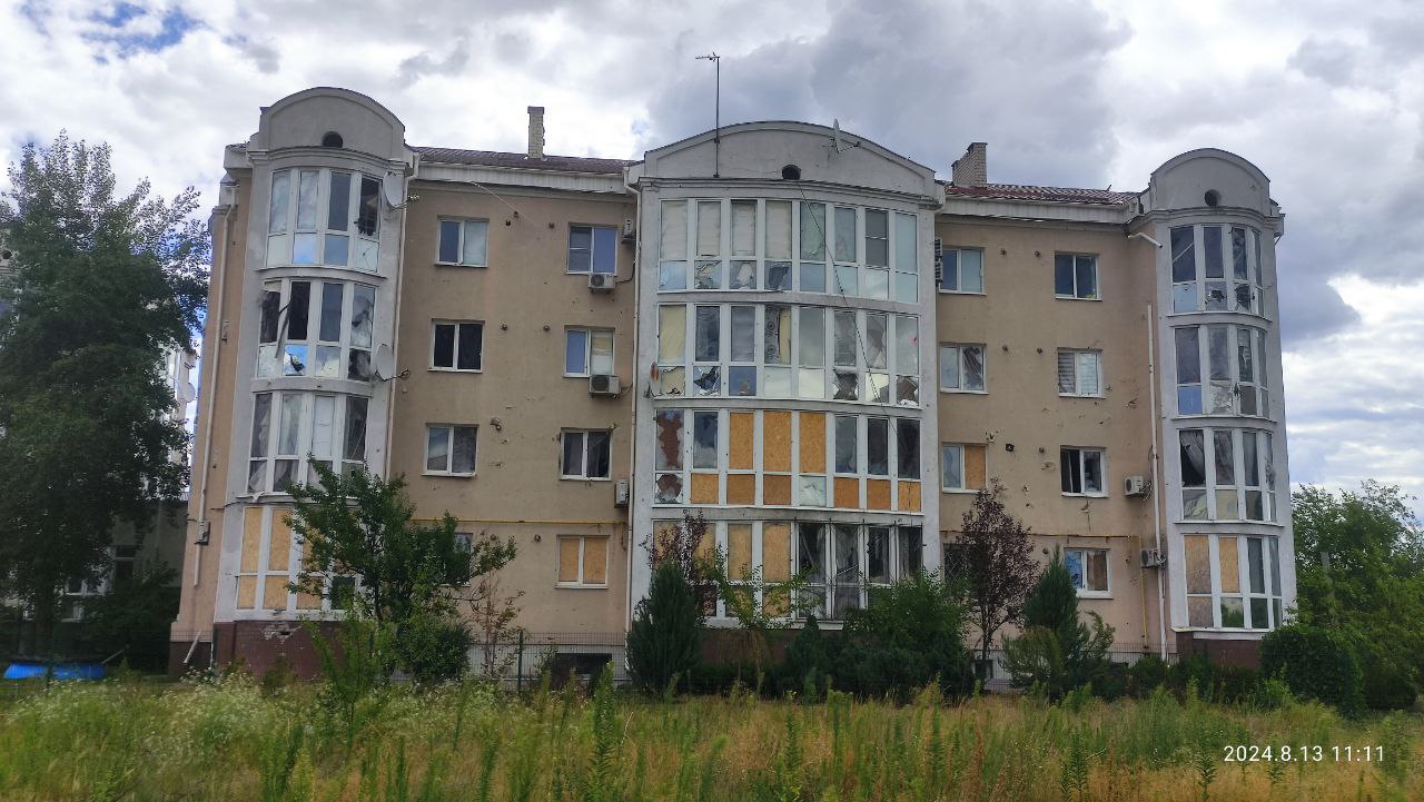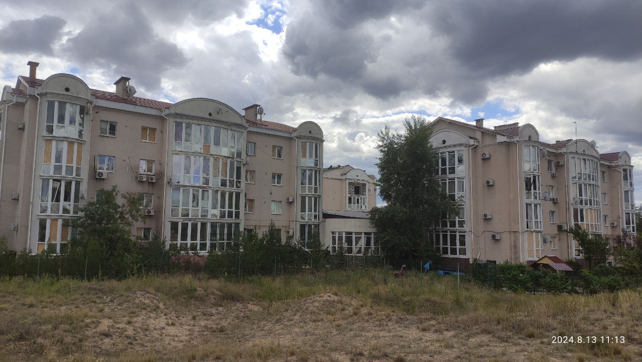 На фото видно, що значна частина даху будівлі відсутня, а вікна вибиті. Знімки демонструють наслідки "визволення": ушкоджені фасади, зруйновані віконні рами й побиті стіни. Територія ЖК заростає бур'янами, що свідчить про відсутність догляду.