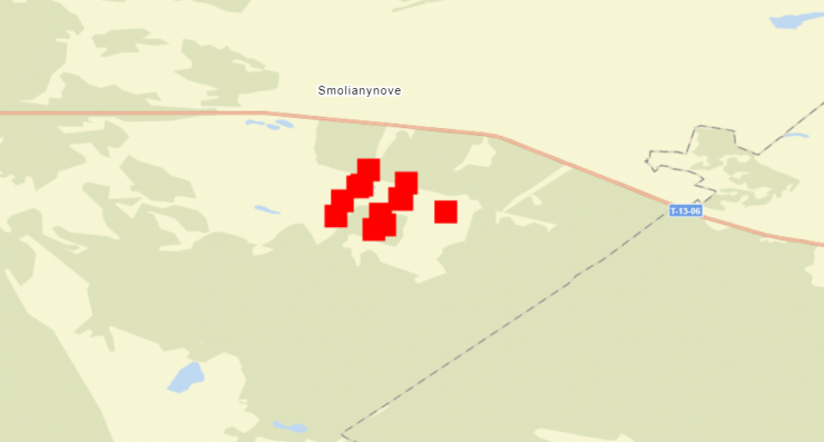Супутникові знімки NASA зафіксували осередки пожеж на південь від Смолянинового 24 вересня. На ранок 25 вересня вогонь продовжує вирувати, хоча інтенсивність спалахів, судячи з карти, дещо знизилася.