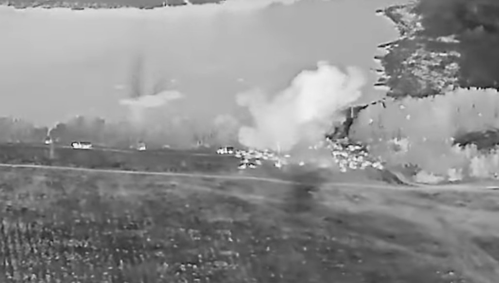 Судячи з кадрів, для удару по російській колоні використовувалися касетні боєприпаси.